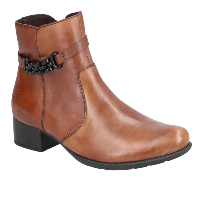 KRÓTKI OPIS: WYGODNE LEKKO OCIEPLANE KOCEM OBUWNICZYM BOTKI RIEKER Z NATURALNEJ LICOWEJ BRĄZOWEJ SKÓRY NA STABILNYM 4 CM OBCASIE.